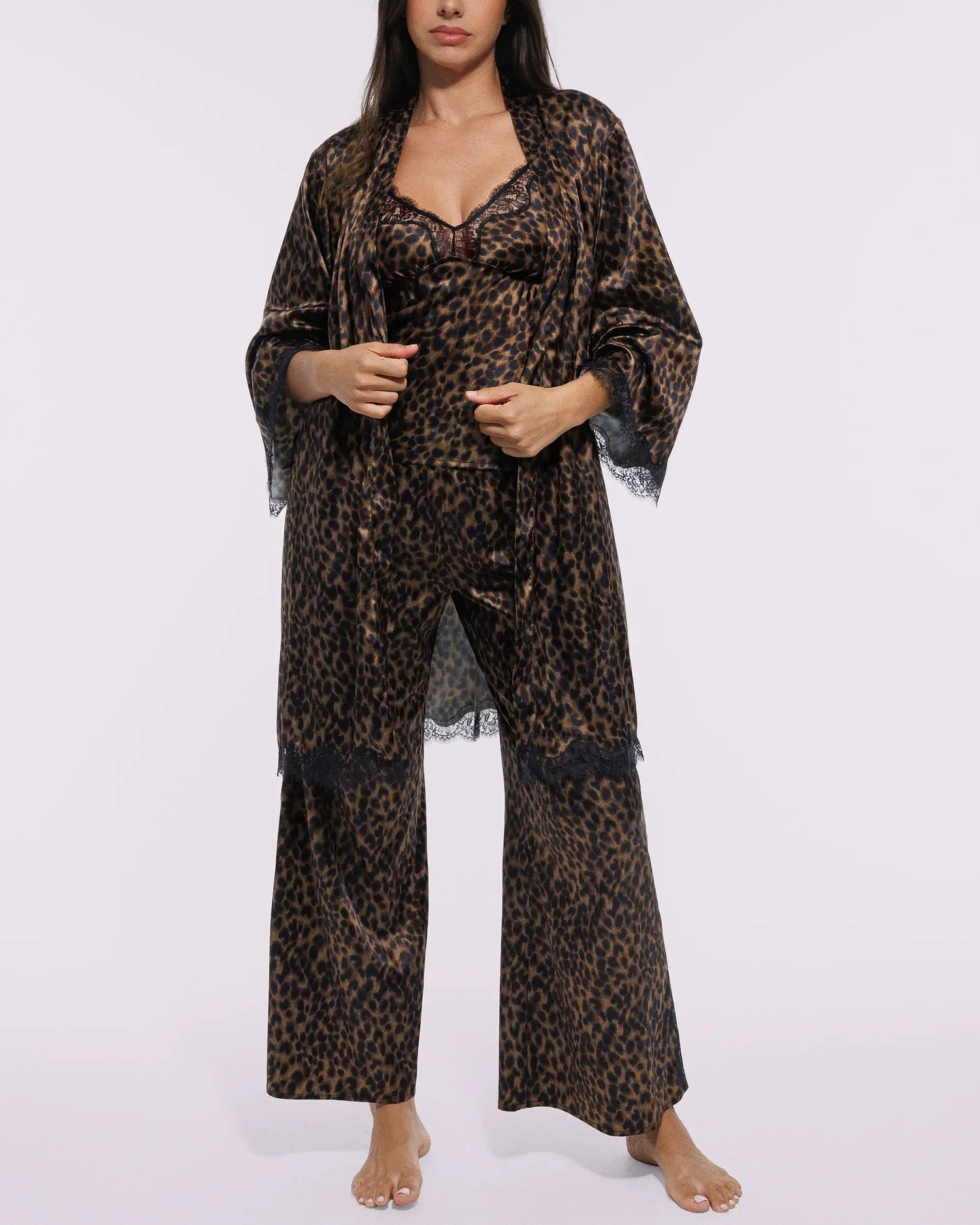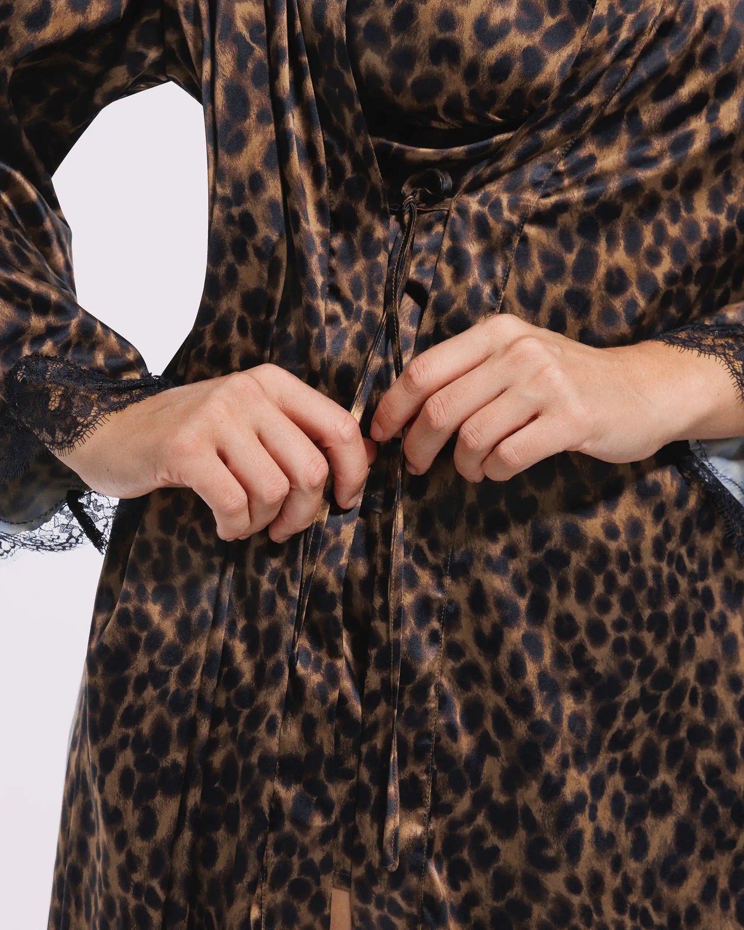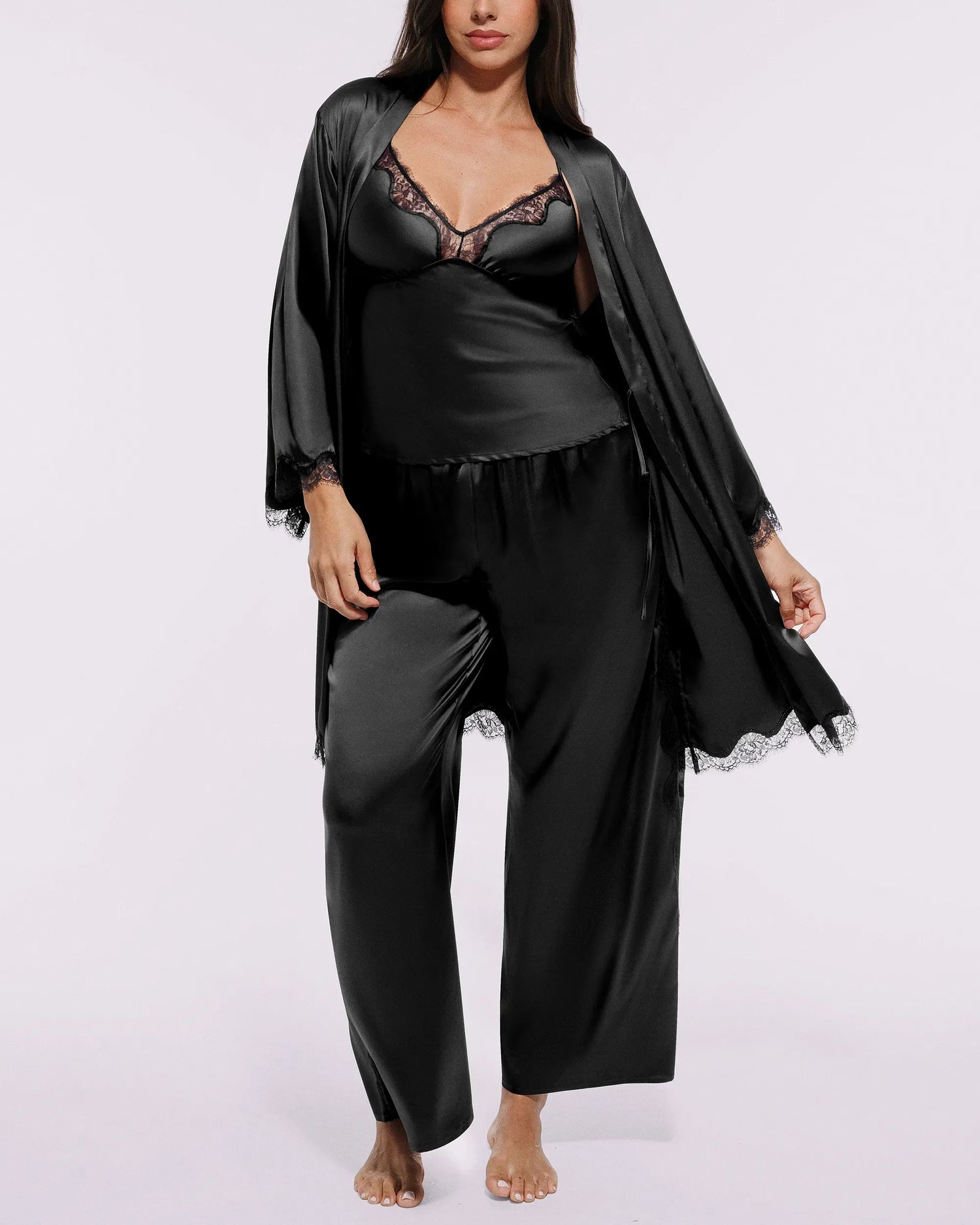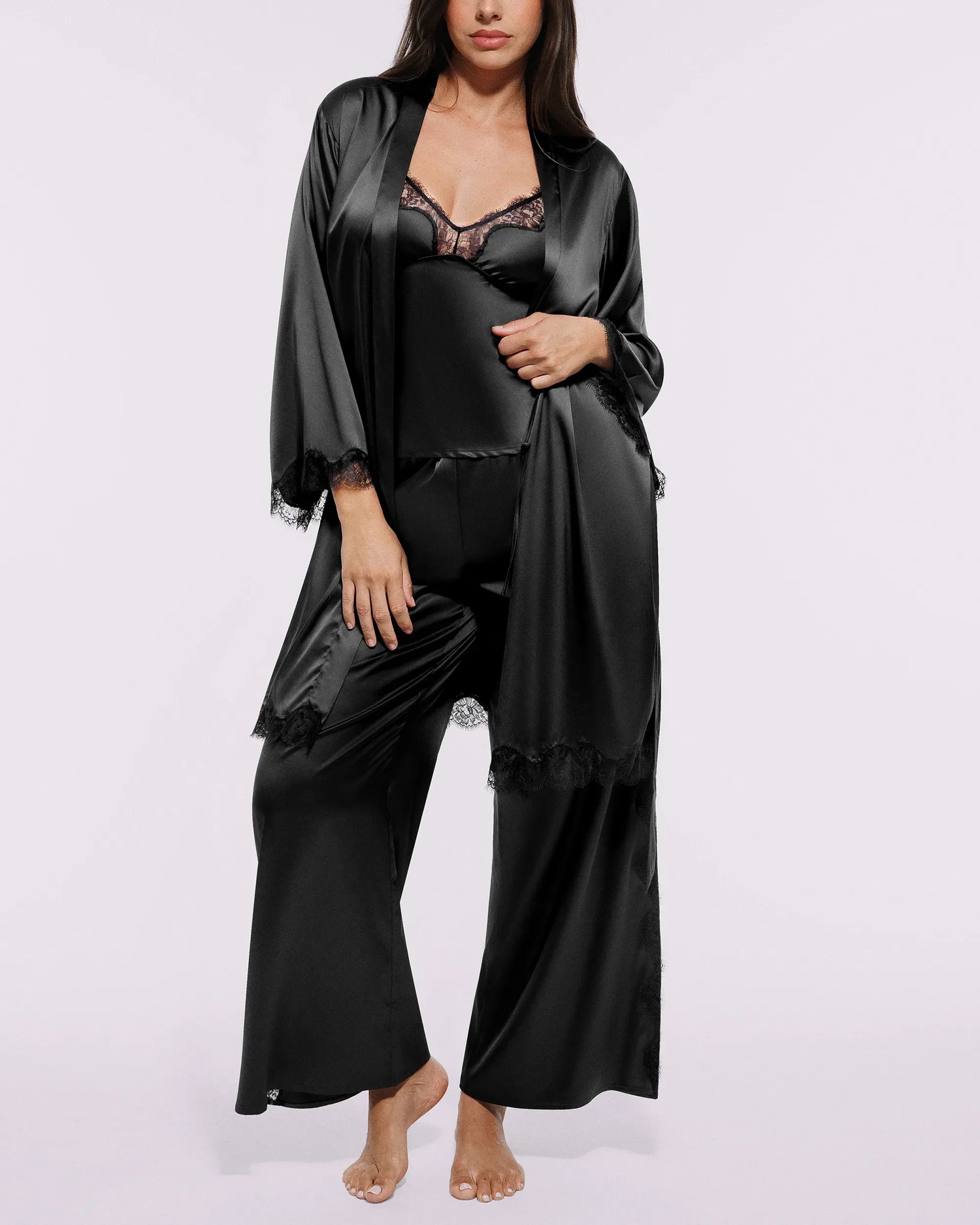 Disfrute de una elegancia natural con nuestra bata de pijama de satén y encaje Bare Essentials™. Su sedosa tela se desliza sobre la piel con un favorecedor escote en V y románticos detalles de encaje. Cuenta con un cinturón ajustable, ideal para usar sobre la ropa de dormir.