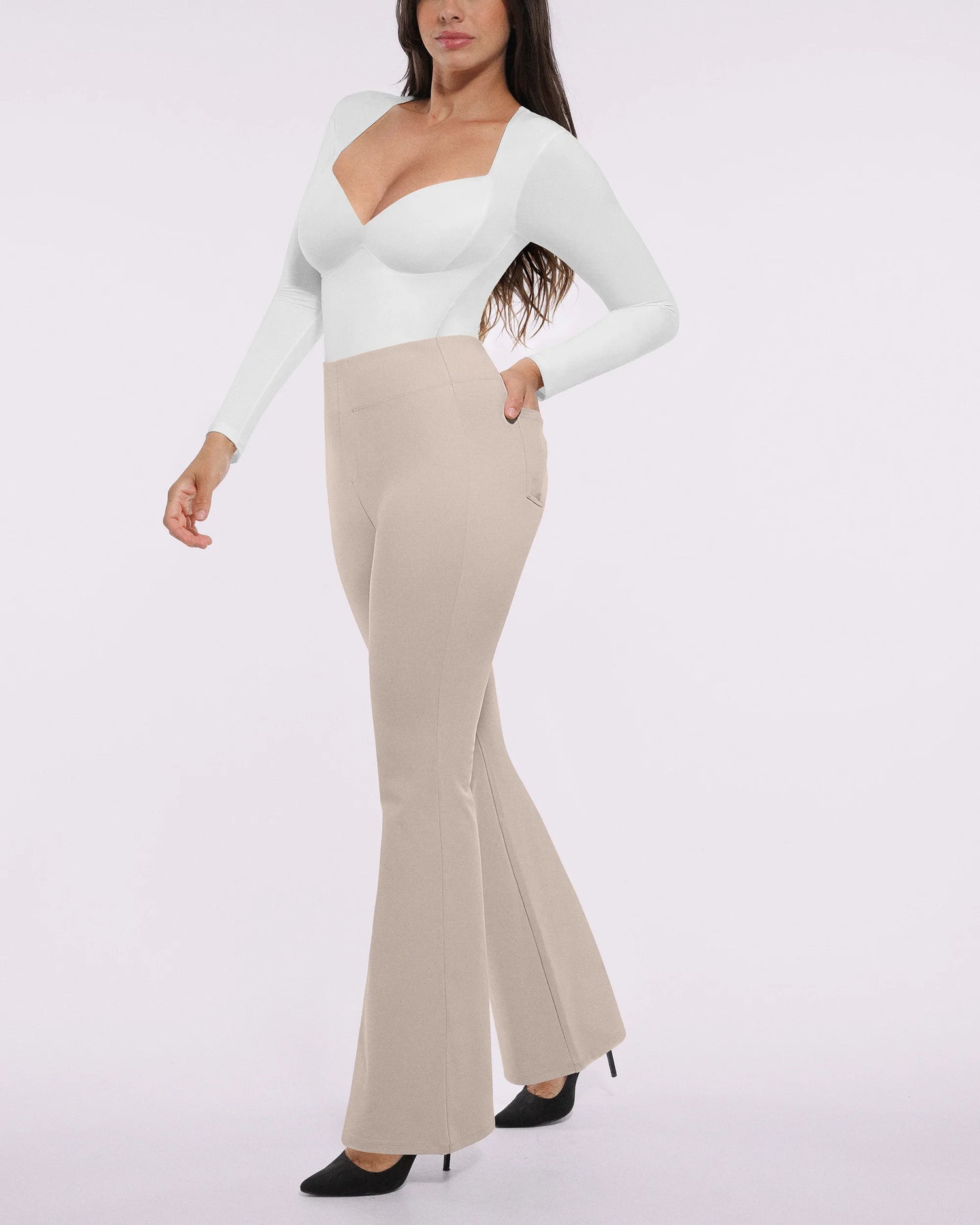 Un pantalon évasé extensible, idéal pour le travail, qui lisse, sculpte et accompagne vos mouvements – du bureau aux courses, avec une élégance naturelle. Sa ceinture gainante intégrée et sa coupe flatteuse mettent en valeur vos courbes, tandis que ses poches discrètes vous permettent de rester bien organisée.